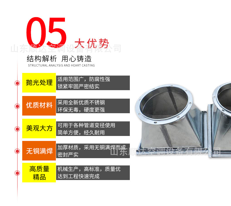 不銹鋼風(fēng)管,不銹鋼風(fēng)管可分為圓形和矩形兩種??筛鶕?jù)工程現(xiàn)場的不同要求,生產(chǎn)各種形狀、各種規(guī)格型號及板材的成品風(fēng)管。不銹鋼風(fēng)管主要材質(zhì)有:SUS304、316、303、310、310S、301、302、304L、316L 、321、201、202、902、904、317、430等。不銹鋼風(fēng)管表面性質(zhì)主要有8K鏡面板、彩色不銹鋼板、不銹鋼磨砂板、不銹鋼拉絲板、不銹鋼花紋板、不銹鋼蝕刻板、鈦金、雪花砂、2B板、BA板和工業(yè) [1] 中厚板。不銹鋼風(fēng)管成品因其優(yōu)異的耐蝕性、耐熱性、高強(qiáng)度等物化性能,主要應(yīng)用于多種氣密性要求較高的工藝排氣系統(tǒng)、溶劑排氣系統(tǒng)、有機(jī)排氣系統(tǒng)、廢氣排氣系統(tǒng)及普通排氣系統(tǒng)室外部分、濕熱排氣系統(tǒng)、排煙除塵系統(tǒng)等。