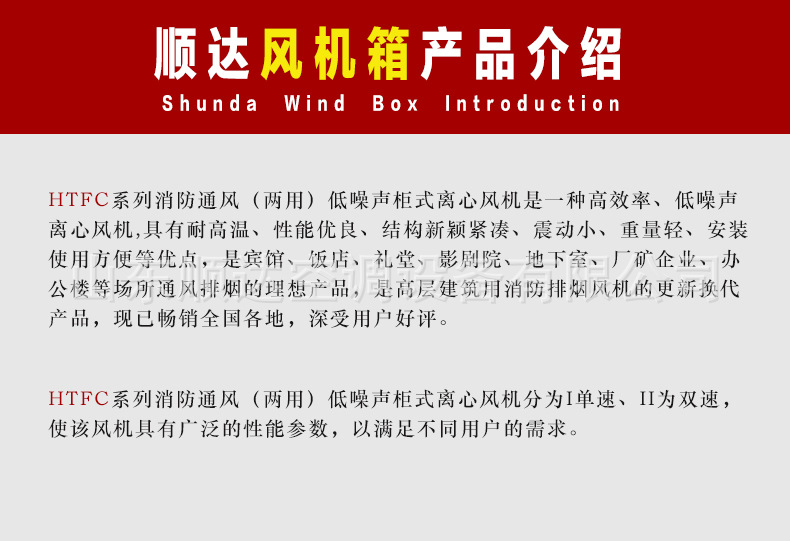 5、風機箱有消防排煙型和通風型兩種類型。消防排煙型采用耐高溫結(jié)構(gòu)板、電動機及傳動部件均安置在風機箱外端,可排放280℃以上的高溫煙氣連續(xù)運行100分鐘以上。